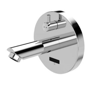 Bocca elettronica “touch-free” da incasso a parete con miscelazione. Dotata di duplice sensore infrarosso, valvola solenoide, regolazione della temperatura, protezione antiscottature regolabile. Funzione di risciacquo igienico regolabile 12 o 24 ore. Alimentata a batteria – 6V litio – con durata fino a 4 anni.