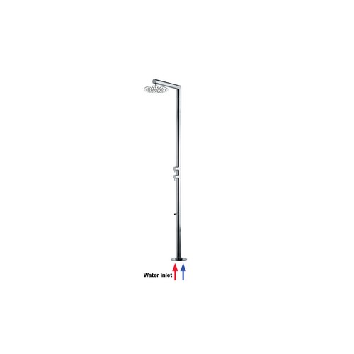 L00382000030008 Colonna doccia NEK da esterno in acciaio INOX AISI 316, con alimentazione acqua a terra. Completa di: kit di fissaggio a pavimento per il collegamento all’impianto idraulico (acqua calda e fredda), 2 rubinetti progressivi, soffione Tetis Ø250 e bocca lavapiedi getto aerato.