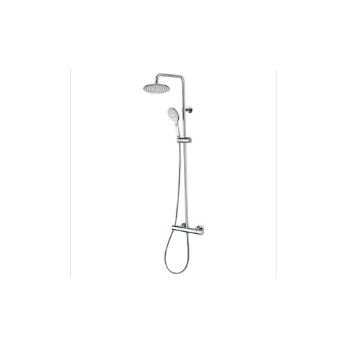 L10053000030008 Colonna murale ottone sezione Ø 20 mm – soffione AGUA Ø 210 mm in ABS – doccetta AGUA-LIFE – supporto doccia orientabile – flessibile ottone doppia aggraffatura 150 cm attacco ½” FF con cono – miscelatore monocomando esterno con deviatore integrato.