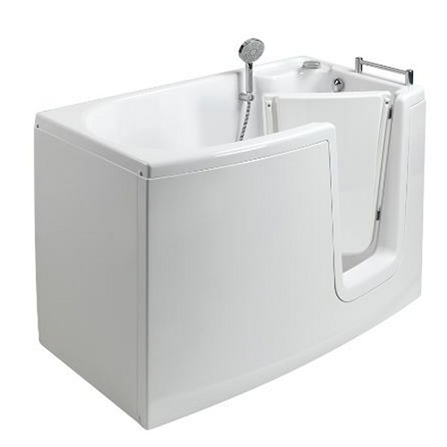 Vasca con porta, ad apertura verso l’interno. Munita di un telaio in acciaio, dotato di piedini regolabili in altezza, su cui è alloggiato il corpo in vetroresina. L’interno offre un’utile superficie per stare in piedi, ed una pratica seduta con schienale.