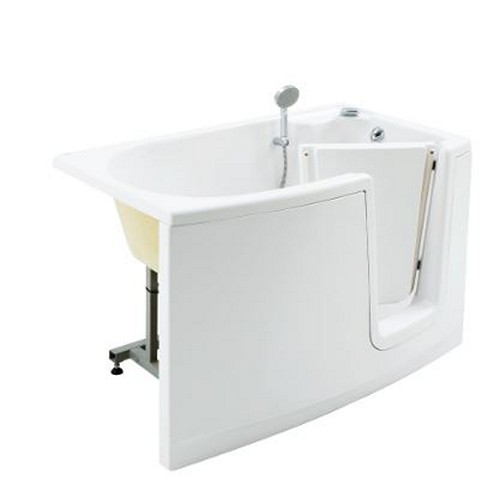 Vasca con porta, ad apertura verso l’interno. Munita di un telaio in acciaio, dotato di piedini regolabili in altezza, su cui è alloggiato il corpo in vetroresina. L’interno offre un’utile superficie per stare in piedi, ed una pratica seduta con schienale.