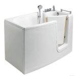Vasca con porta, ad apertura verso l’interno, prevede l’installazione della piletta incassata nel pavimento. Munita di un telaio in acciaio, dotato di piedini regolabili in altezza, su cui è alloggiato il corpo in vetroresina. L’interno offre un’utile superficie per stare in piedi, ed una pratica seduta con schienale.