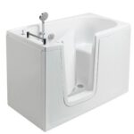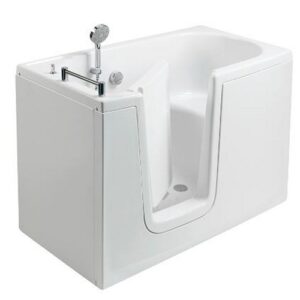 Vasca con porta, ad apertura verso l’interno, munita di un telaio in acciaio, dotato di piedini regolabili in altezza, su cui è alloggiato il corpo in vetroresina. L’interno offre un’utile superficie per stare in piedi, ed una pratica seduta con schienale.