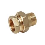 Raccordo diritto in tre pezzi, con attacchi filettati femmina-maschio a bocchettone. In ottone.