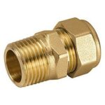 Raccordo curvo 90° in tre pezzi, con attacchi filettati femmina-maschio a bocchettone. In ottone.