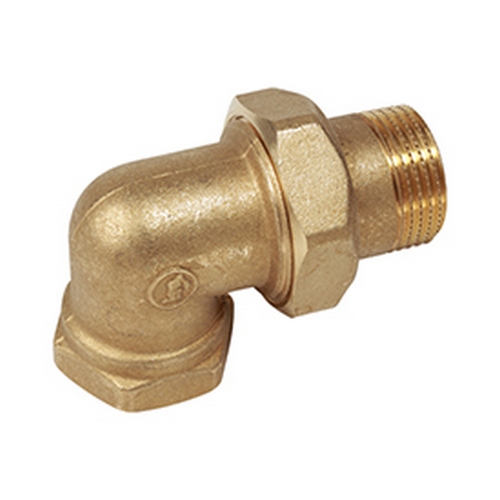 R19Y017 Raccordo curvo 90° in tre pezzi, con attacchi filettati femmina-maschio a bocchettone. In ottone. Idoneo per utilizzo in impianti idraulici, di distribuzione gas e impianti solari termici.
