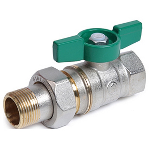 R259WX029 Valvola a sfera, in ottone nichelato, con attacchi femmina-maschio a bocchettone.