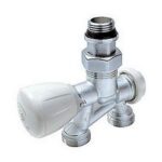Valvola micrometrica termostatizzabile, a squadra, in ottone, cromata, con attacco per adattatore tubo rame, plastica o multistrato. Per impianti bitubo. Senza sonda. Dotata di detentore di regolazione.