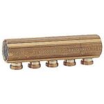 Collettore di distribuzione di ritorno, con valvole di intercettazione dotate di volantino manuale predisposte per comando elettrotermico, in ottone.