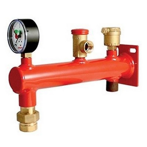 Collettore portastrumenti con corpo in acciaio, per il raggruppamento di diversi componenti per centrale termica. Predisposto per fissaggio a parete. Adduzione 3/4” M.