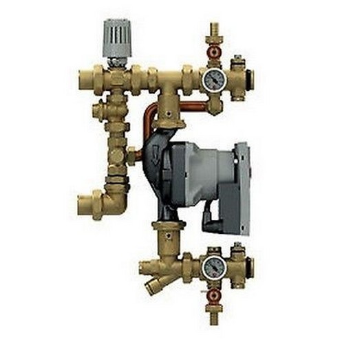 Gruppo di miscelazione a punto fisso, in ottone. Attacchi da 1″ per collettori di distribuzione. Miscelazione ottenuta mediante valvola a tre vie con testa termostatica R462L.
