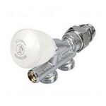 Valvola manuale a regolazione semplice, a squadra, in ottone, cromata, con attacco per tubo ferro.