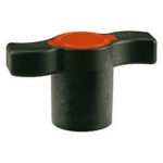 Maniglia a farfalla prolungata in plastica per valvole a sfera, con placchetta rossa.