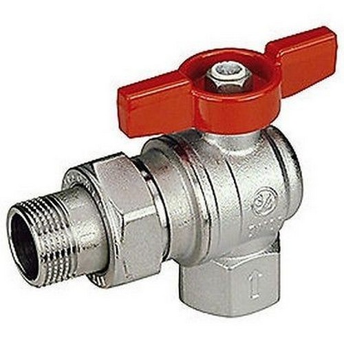 Valvola a sfera a squadra, in ottone cromato, con attacchi femmina-maschio a bocchettone.