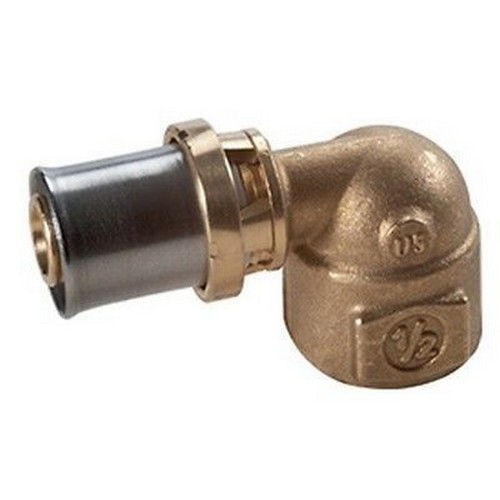Raccordo curvo 90° filettato femmina, a pressare multipinza. In ottone.