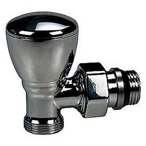 Valvola per termoarredo, manuale a regolazione semplice, a squadra, in ottone, cromata lucida, con attacco per adattatore tubo rame, plastica o multistrato.