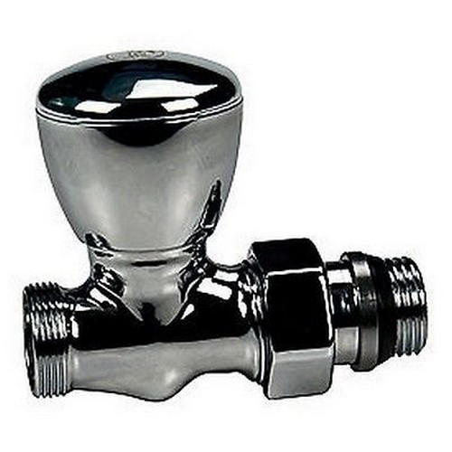 Valvola per termoarredo, manuale a regolazione semplice, diritta, in ottone, cromata lucida, con attacco per adattatore tubo rame, plastica o multistrato.