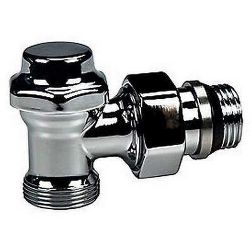 Detentore per termoarredo, a squadra, in ottone, cromato lucido, con attacco per adattatore tubo rame, plastica o multistrato.