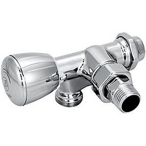 Valvola micrometrica termostatizzabile per termoarredo, a squadra, in ottone, cromata lucida, con attacco per adattatore tubo rame, plastica o multistrato. Per impianti monotubo. Senza sonda. Dotata di detentore di regolazione.