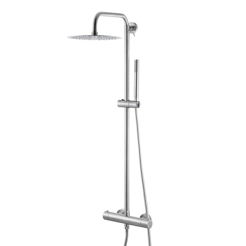 Colonna doccia esterna da parete con soffione tondo, miscelatore termostatico, con deviatore incorporato e set doccetta.