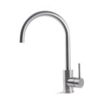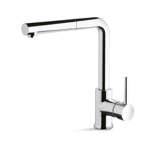 Miscelatore monocomando per lavello con canna elle girevole e doccetta estraibile.